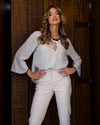 Delicada e cheia de charme, esta blusa em estampa de poá combina leveza e sofisticação. O decote com recorte frontal e detalhe contrastante traz um toque moderno, enquanto as mangas flare garantem fluidez e movimento ao look. Ideal para compor produções elegantes do dia à noite.