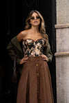 Este corpete floral estruturado é uma peça marcante que alia elegância e sensualidade. Com um corte ajustado que valoriza a silhueta, destaca-se pela sua estampa floral em tons terrosos e suaves. A estrutura interna com barbatanas suaves proporciona suporte e definição, tornando-o ideal tanto para ocasiões especiais como para looks casuais mais ousados quando combinado com peças de cintura alta. Composição: 90% Poliester, 10% Elastano.