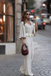 Macacão com detalhe de flores na cintura em tom beige, perfeito para um look casual de outono.