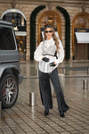 Top cropped com aplicações brilhantes, trazendo um toque glamouroso e moderno. A peça valoriza o look com elegância e é perfeita para ocasiões especiais ou para dar destaque à produção.