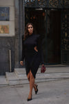 Elegância e atitude se unem neste vestido preto de corte sofisticado, apresenta mangas longas e ombros estruturados, que conferem uma silhueta poderosa e contemporânea.