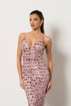 Vestido comprido justo em tom rosa blush, com aplicação de lantejoulas e brilho sofisticado. Decote em V com alças finas e silhueta elegante, ideal para festas, eventos noturnos e ocasiões especiais.